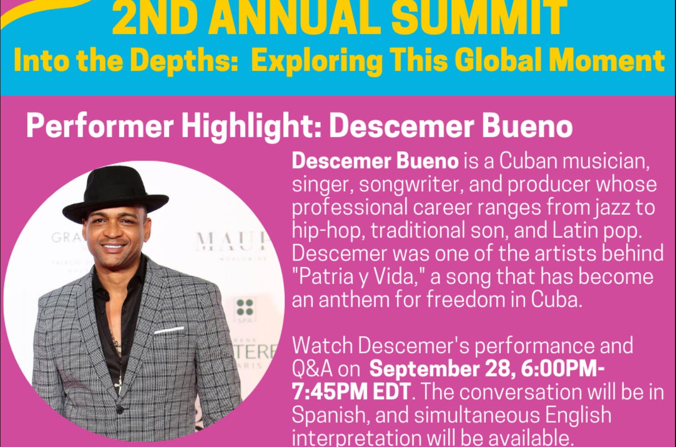 Después de la charla, Descemer tocará canciones escritas específicamente para crear conciencia sobre los problemas sociales. La conversación será en español con interpretación simultánea en inglés.