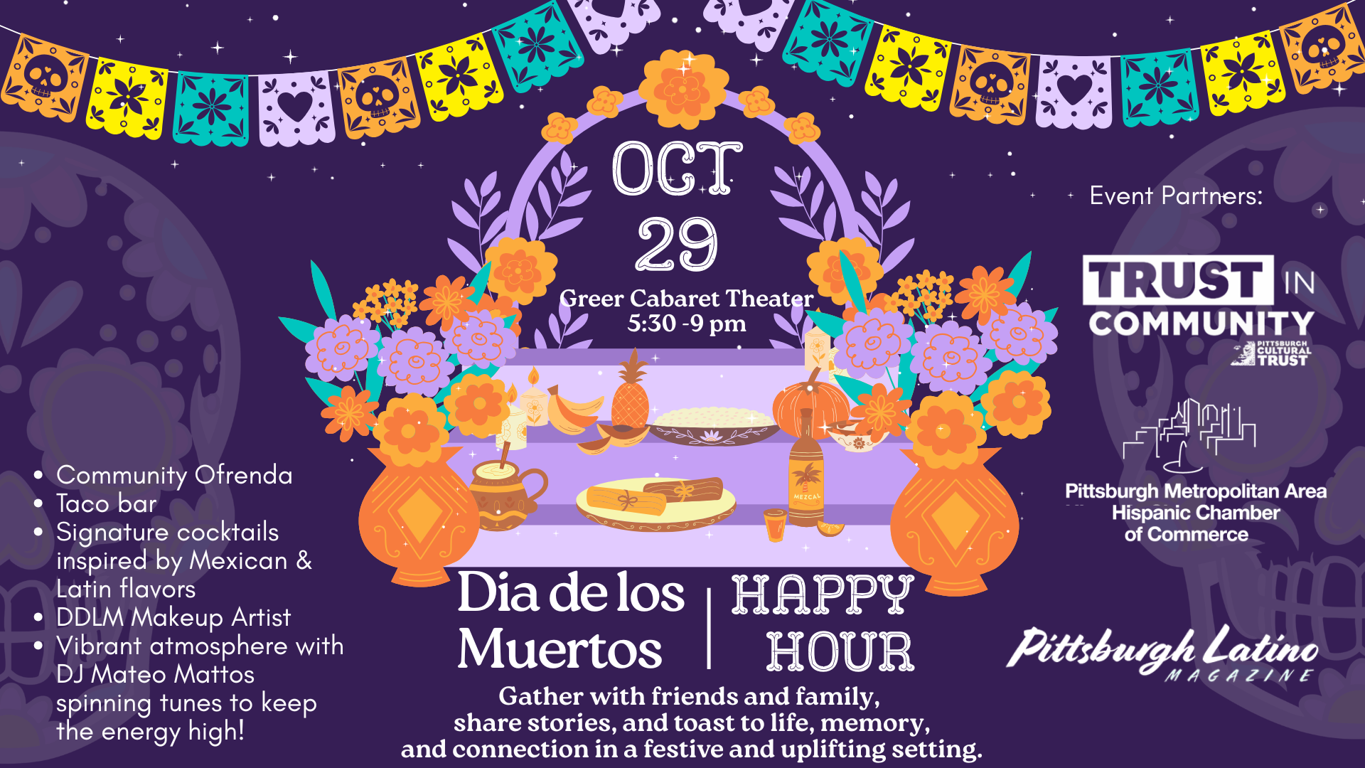 Únete a Pittsburgh Latino Magazine, la Cámara de Comercio Hispana del Área Metropolitana de Pittsburgh (PMAHCC) y el Pittsburgh Cultural Trust en Ofrenda Happy Hour, una vibrante celebración en honor al Día de los Muertos, el miércoles 29 de octubre en el Greer Cabaret Theater. El evento se llevará a cabo de 5:30 a 9:00 p.m. y marcará el inicio oficial de una semana de festividades del Cultural Trust dedicadas a esta colorida y profundamente significativa tradición mexicana.