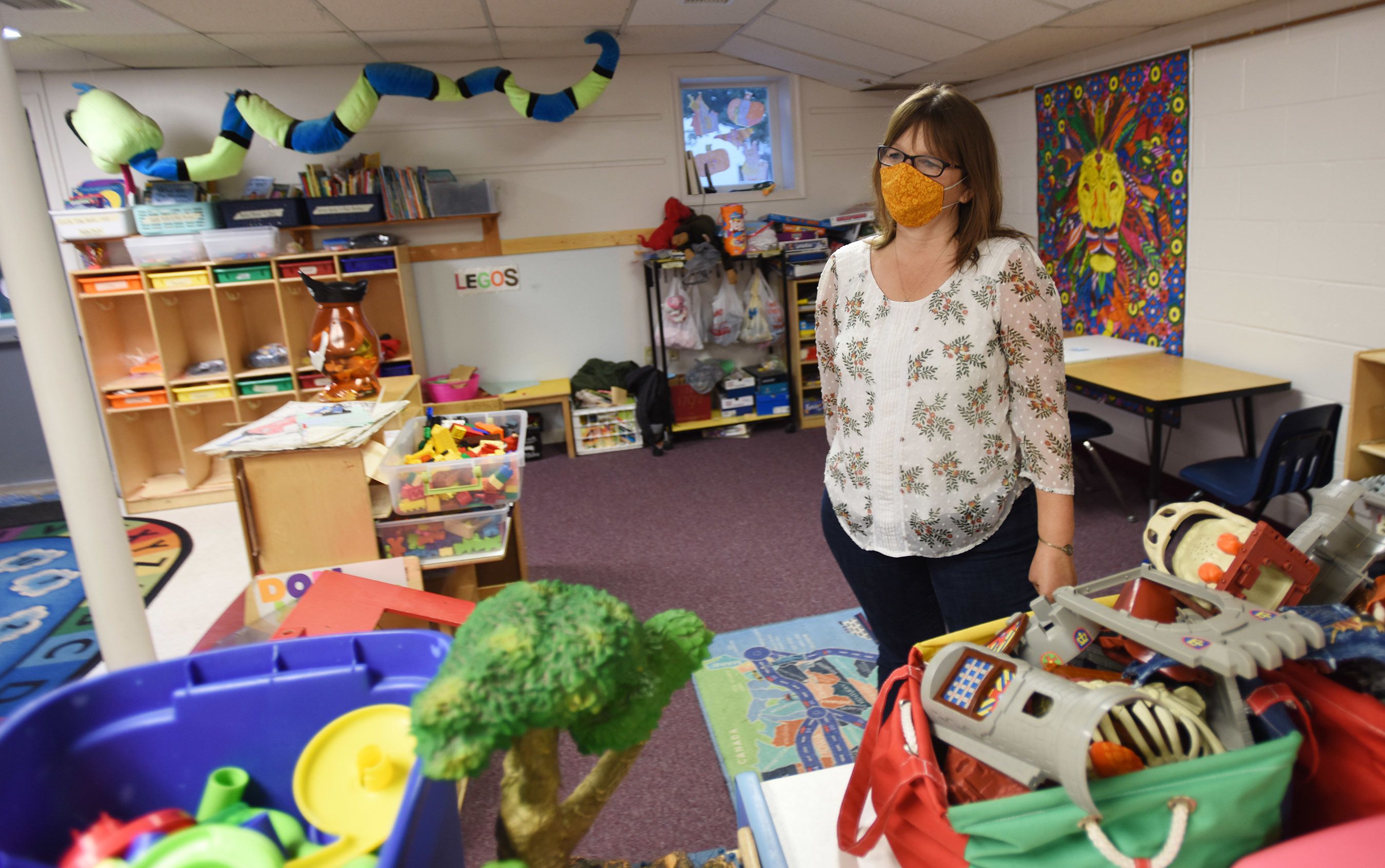 But there are also many signs of the coronavirus’ lasting impact. Red, blue, and other colored blocks lay on a table, left out to dry after being disinfected. Puppets and other plush toys that are harder to clean day after day sit on a high shelf, out of reach.