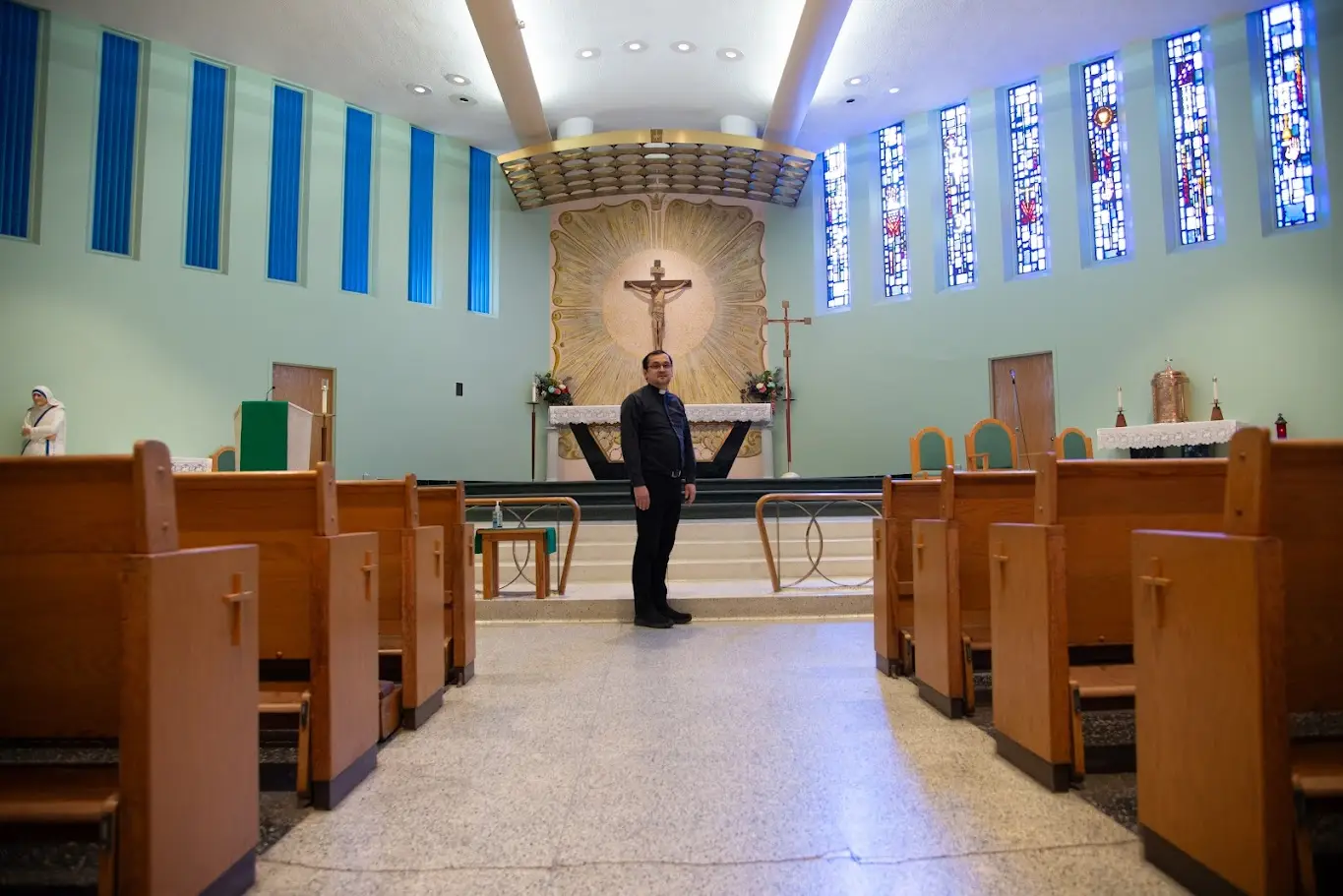 Rev. Fernando Torres Aguirre near the altar at St. Catherine of Siena Church in Beechview on Feb. 14, 2025. Although attendance at the church has declined somewhat due to fear, Torres said that “so far,” worship there “has been very safe…” (Amaya Lobato Rivas/PublicSource)